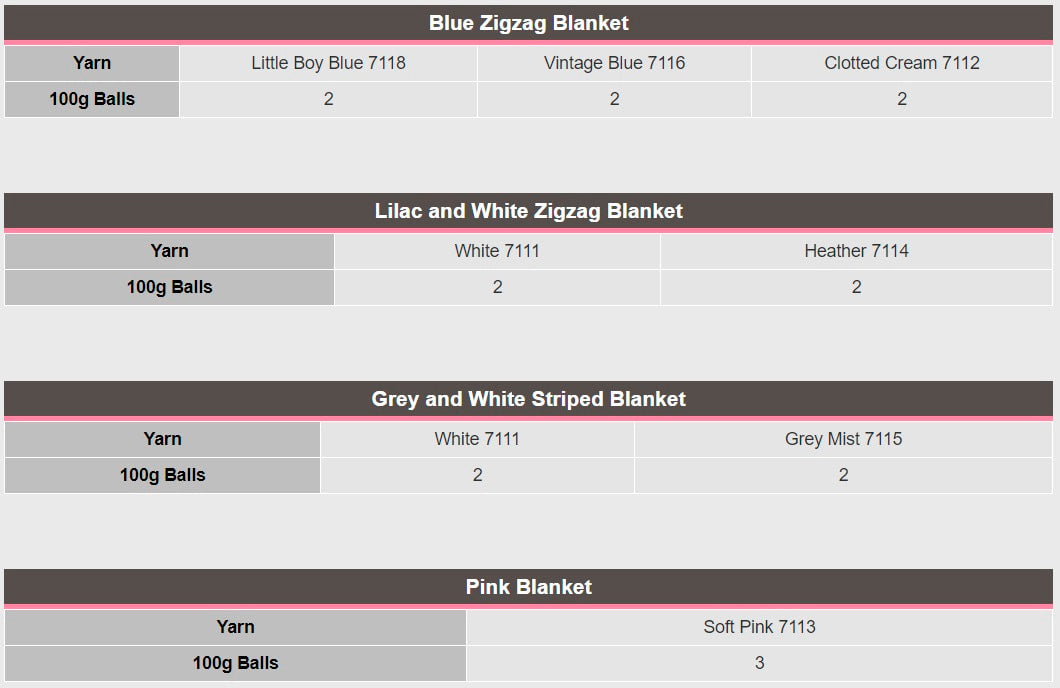 You will need: 1 pair 4 mm (UK 8 – U SA 6 ) knitting needles Striped and Pink Blankets Only: 1 pair 3¼ mm (UK 10 – USA 3) knitting needles.